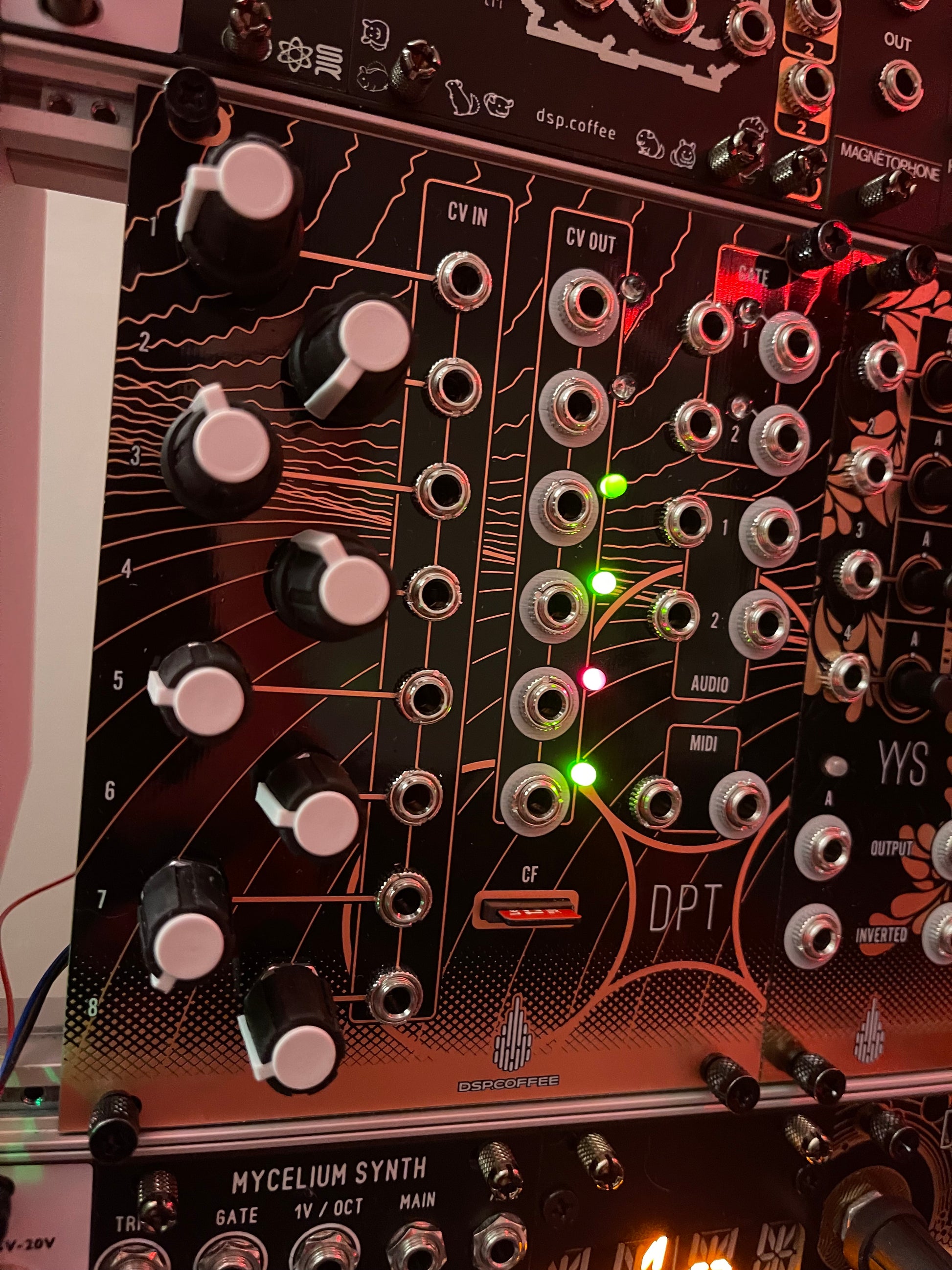- 4 12-bit CV (or lofi audio w/ some hacking) from external DAC7554, scaled to -7v to 7v.